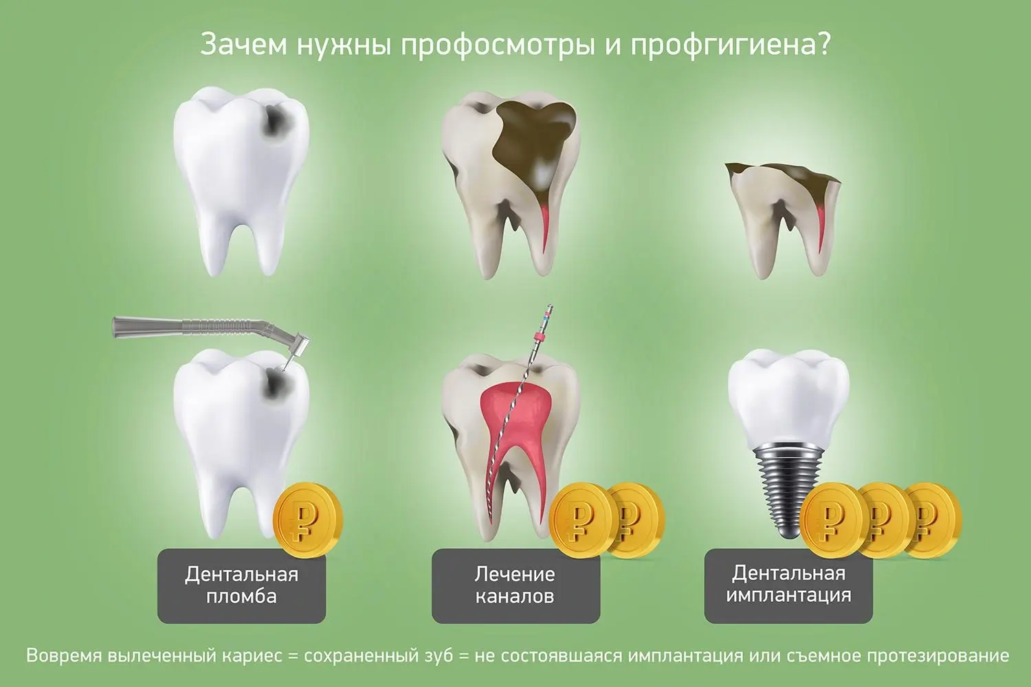 — Сегодня уже не надо объяснять, зачем нужны профилактические осмотры и профгигиена (профилактическая чистка зубов), своевременная терапия, лечение кариеса. Все знают, что надо вовремя обращаться, не доводить до разрушения зубов, до более сложного, более длительного и дорогого лечения, протезирования. Все понимают, что вовремя вылеченный кариес — это сохраненный зуб, а это — не состоявшаяся имплантация или съемное протезирование. Ведь, как известно, лучшая операция — та, которая не состоялась.